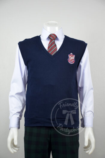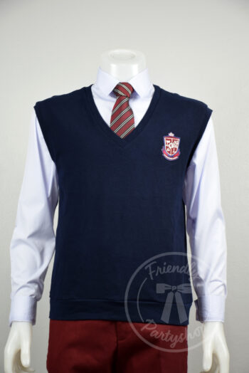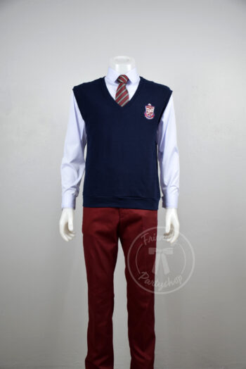 ชุดนักเรียนเกาหลีชาย เสื้อสีขาวแขนยาว เสื้อกั๊กสีกรม กางเกงขายาวสีแดงเลือดหมู