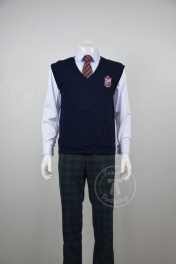 ชุดนักเรียนเกาหลีชาย เสื้อสีขาวแขนยาว เสื้อกั๊กสีกรม กางเกงขายาวลายสก็อตสีเขียวเข้ม